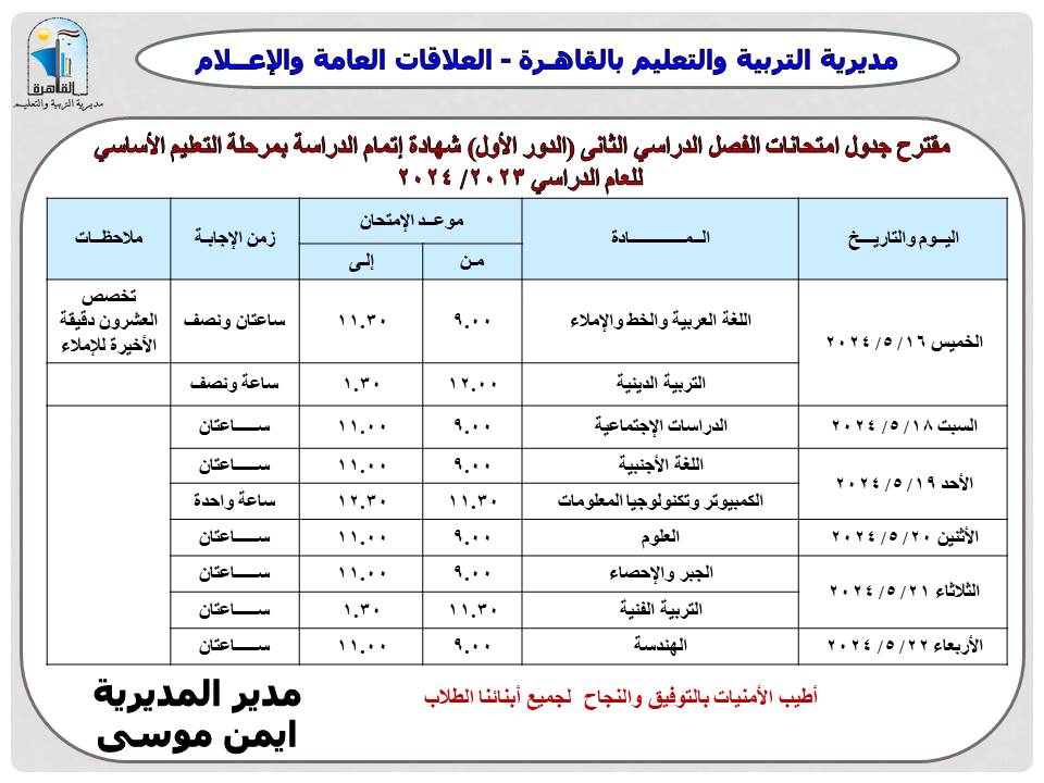 جداول امتحانات النقل والشهادة الإعدادية الترم الثاني بالقاهرة والجيزة