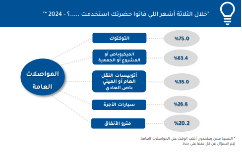 وأفاد معلومات الوزراء، أنه تمثلت أهم نتائج الاستطلاع في أن 70% من المواطنين بالعينة أوضحوا أنهم يعتمدون على المواصلات العامة خلال الأشهر الثلاثة السابقة لإجراء الاستطلاع، وجاء في المقدمة كل من: التوكتوك %75، والميكروباص، أو ما يطلق عليه في بعض المحافظات المشروع، أو الجمعية 63.4%%.