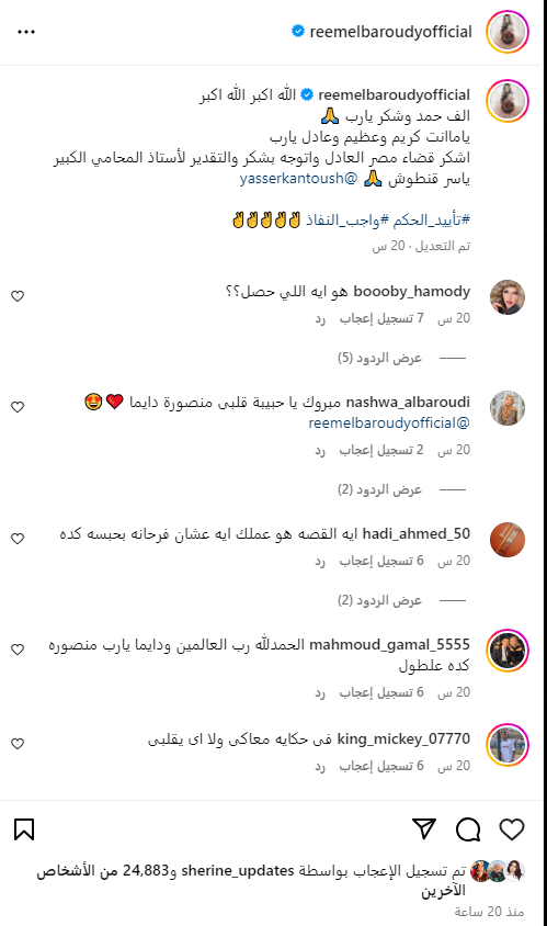 وبعد نشر محادثات ريم البارودي الخاصة، أدى ذلك إلى مرورها بعدة أزمات، وفي أول تعليق من الفنانة بعد حصولها على حكم حبس عام ضد أحد الصحفيين، قالت الفنانة في منشور عبر حسابها الشخصي بـ موقع تبادل الصور والفيديوهات القصيرة إنستجرام: الله أكبر الله أكبر.. ألف حمد وشكر يا رب، ياما أنت كريم وعظيم وعادل يا رب.. أشكر قضاء مصر العادل.