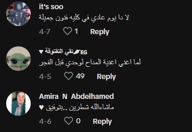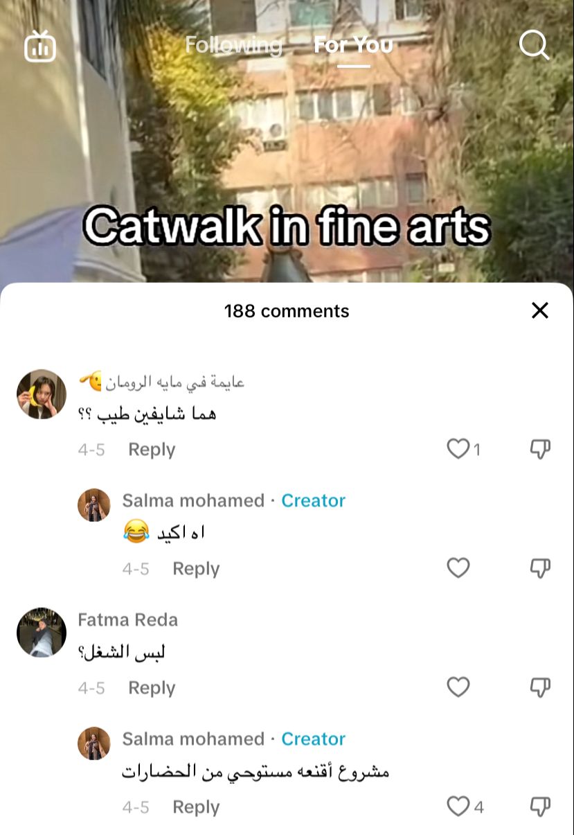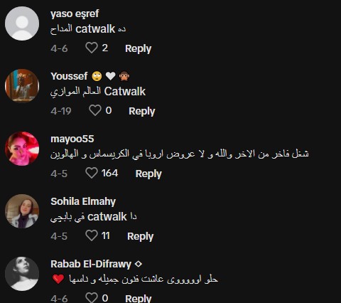 وأضافت إحدى متابعات تيك توك: شغل فاخر من الآخر والله ولا عروض أوروبا في الكريسماس والهالوين، وأخرى: دا catwalk في بابچي، ومتابعة أخرى تشارك بتعليق ساخر: سوق الجمعة ايه دي أرض زيكولا، رابطة بين ما يقدمه الطلاب وما تشمله الرواية الشهيرة من لقطات خيالية مُرعبة.