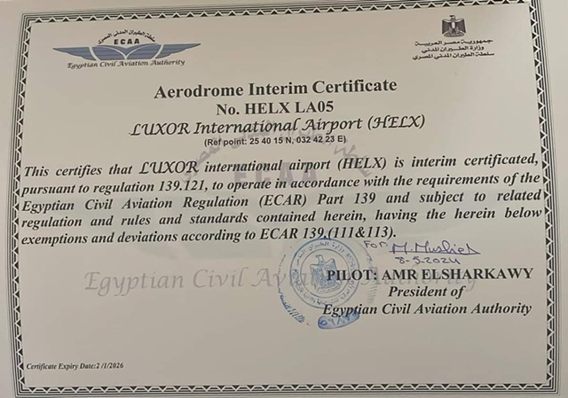 مطار الأقصر الدولي يحصل على شهادة تجديد الترخيص حتى 2026 | صور