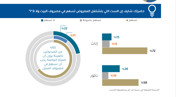وخلال نتائج استطلاعات الرأي أكد 65% من المواطنين بالعينة على ضرورة أن تسهم المرأة العاملة في مصروف المنزل، وارتفعت النسبة بين الإناث دونًا عن الذكور بواقع 72% من الإناث، و58% من الذكور.