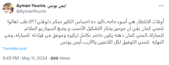 وحرص أيمن يونس نجم نادي الزمالك السابق، على توجيه رسالة إلى جوميز المدير الفني للزمالك قبل مباراة نهضة بركان، وذلك عبر حسابه الرسمي على منصة إكس، قائلا: أوقات الانتظار هي أسوأ حاجة.. أكيد ده إحساس الكتير منكم دلوقتي؟!