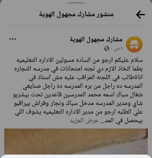 وقال الطالب عبر حسابه: سلام عليكم أرجو من السادة مسؤولي الإدارة التعليمية بطما اتخاذ اللازم.. دي لجنة امتحانات في مدرسة التجارة أنا طالب في اللجنة المراقب عليه مش إستاذ في المدرسة ده راجل من برة المدرسة ده راجل صنايعي شغال سباك اسمه محمد.