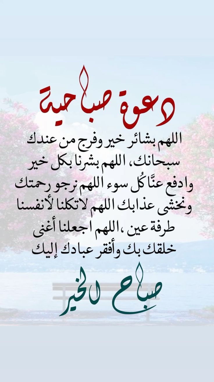 - اللهم في هذا الصباح سخّر لنا من حظوظ الدنيا ما تعلم أنه خيرٌ لنا، اللهم قلوبنا بين يديك فـارزقها الثبات والراحة، اللهم ارزقني برزق من عندك لا حد له، وفرج من عندك لا مد له وخير من عندك لا عدد له.