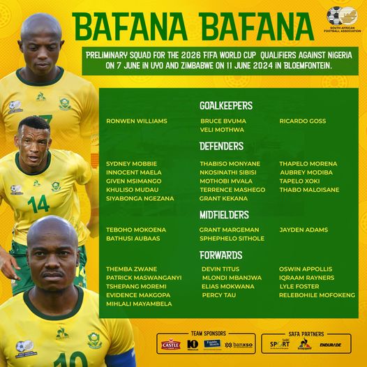 أعلن هوجو بروس المدير الفني لـ منتخب جنوب إفريقيا، قائمة البافانا فانا، لحوض منافسات التصفيات الإفريقية المؤهلة لكأس العالم 2026.