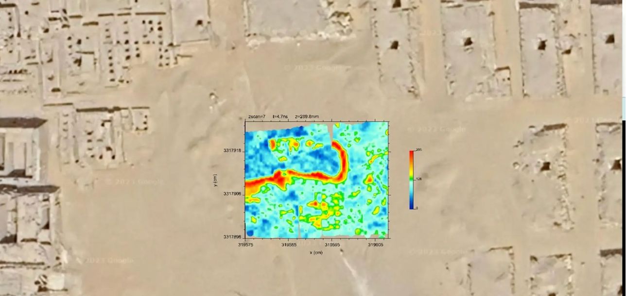وواصلت الدراسة: أجرينا استطلاعات GPR وERT في المقبرة الغربية، الجيزة، مصر، نعتقد أننا حددنا هيكلًا على شكل حرف L يبلغ نحو 10 أمتار × 15 مترًا على عمق 0.5-2 مترًا، مليئًا بالرمال المتجانسة، مما يعني على الأرجح أن الفراغ كان مليئًا بالرمال بعد البناء، وفي نفس الموقع، ولكن في العمق الأعمق، يُظهر ERT حالة شاذة شديدة المقاومة، والتي قد تكون مادة مقاومة للغاية مثل الرمال أو الفراغ، يمتد هذا الشذوذ إلى 3.5-10 م في العمق وعلى مساحة أفقية تبلغ 10 م × 10 م.