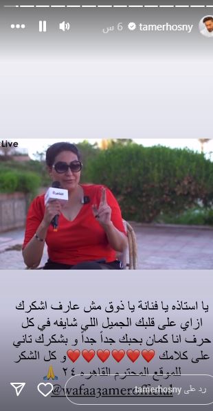 وشارك تامر حسني جزءا من لقاء وفاء عامر مع القاهرة 24، عبر حسابه الشخصي بموقع انستجرام، وعلق عليه قائلًا: يا أستاذة يا فنانة يا ذوق مش عارف أشكرك إزاي على قلبك الجميل اللي شايفه في كل حرف، أنا كمان بحبك جدًا، وبشكرك تاني على كلامك، وشكرًا للموقع المحترم القاهرة 24.