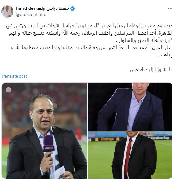 كتب حفيظ دراجي عبر حسابه الشخصي على موقع إكس: مصدوم وحزين لوفاة الزميل العزيز أحمد نوير مراسل قنوات بي إن سبورتس في القاهرة، أحد أفضل المراسلين وأطيب الزملاء، رحمه الله وأسكنه فسيح جناته وألهم ذويه وأهله الصبر والسلوان.