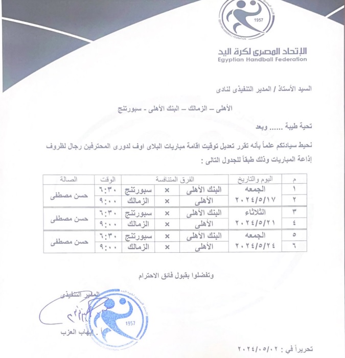 يلعب فريق اليد بالنادي الأهلي مع نظيره فريق الزمالك، يوم الثلاثاء المقبل في ثاني مواجهة الدور النهائي من دوري المحترفين بنظام البلاي أوف للموسم الرياضي 2023-2024.