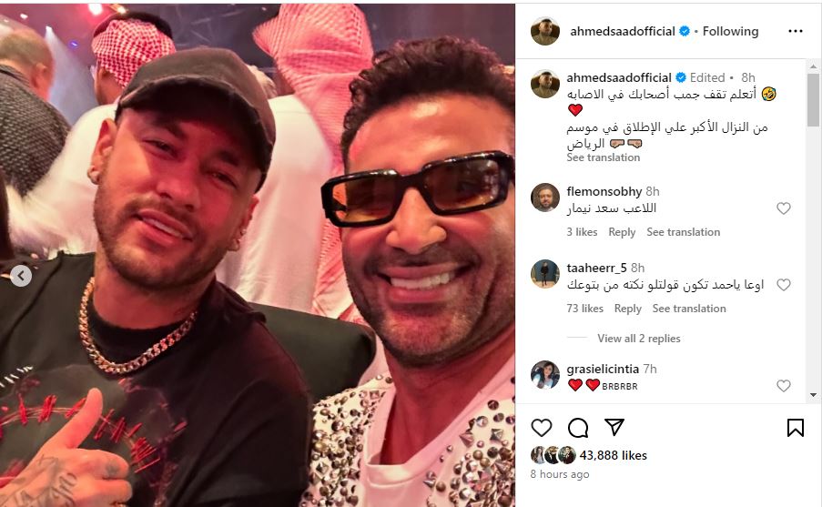 شارك أحمد سعد متابعيه صورة جمعته بـ لاعب الهلال السعودي نيمار،عبر حسابه الشخصي بموقع انستجرام، أثناء تواجده في موسم الرياض.