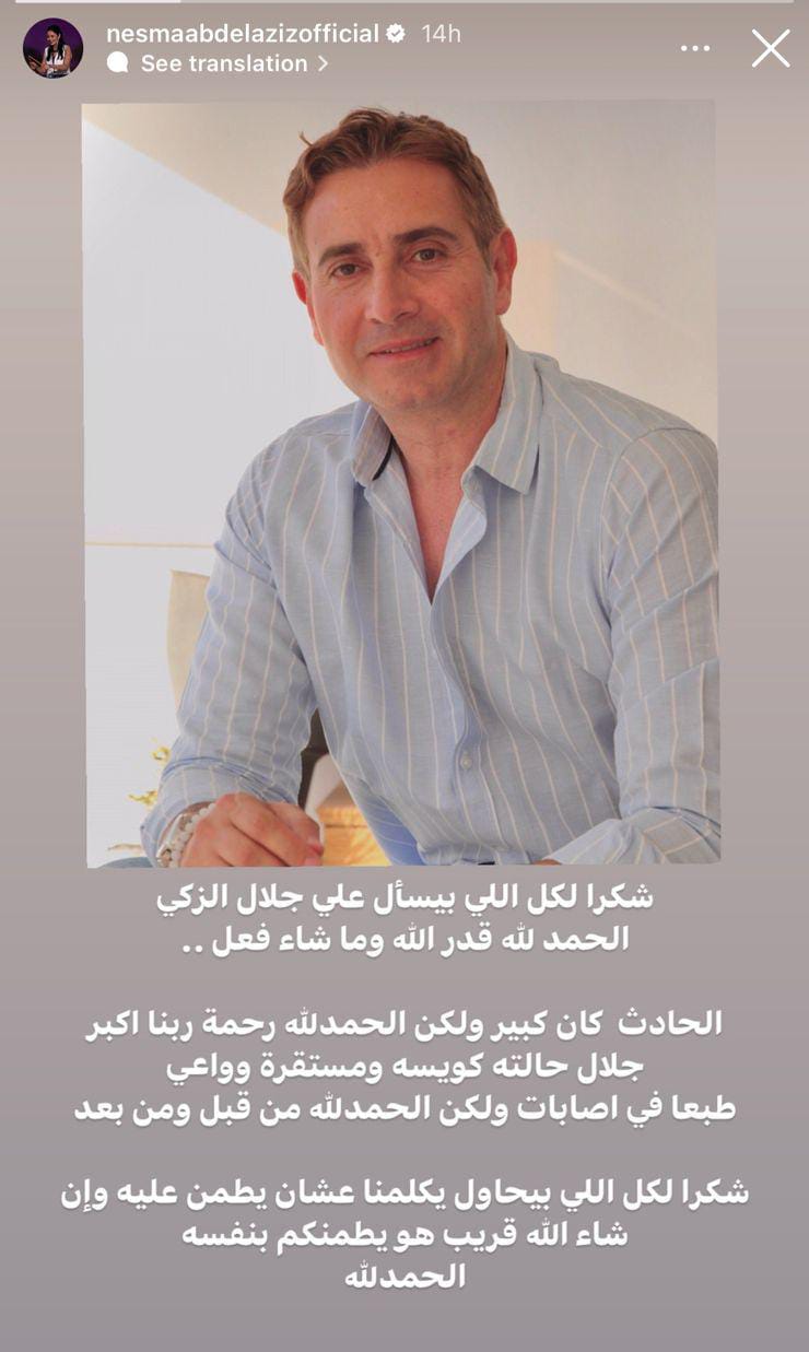 وشاركت نسمة عبد العزيز صورة لـ زوجها جلال الزكي، عبر حسابها الشخصي بموقع إنستجرام، وعلقت عليها قائلة: شكرًا لكل اللي بيسأل على جلال الزكي، الحمد لله قدر الله وما شاء فعل، الحادث كان كبير ولكن الحمد الله ربنا أكبر.