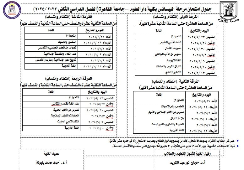 امتحانات كلية دار العلوم جامعة القاهرة الترم الثاني 2024
