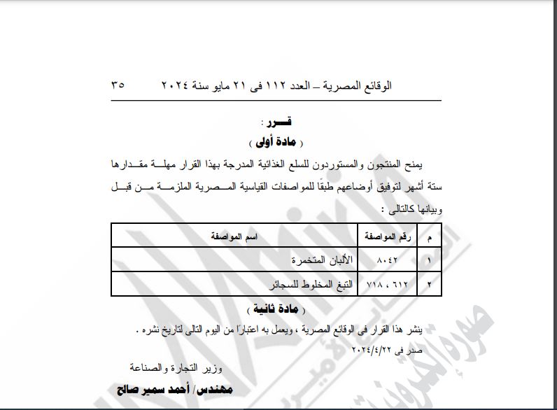 نشرت الجريدة الرسمية اليوم الثلاثاء 21 مايو 2024، قرار وزارة الصناعة والتجارة برئاسة أحمد سمير، رقم 143 لسنة 2024، والذي نص على ما يلي:-