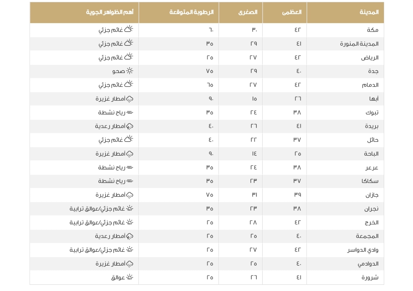 ووفقا للمركز، فإن درجات الحرارة في السعودية اليوم ونسب الرطوبة وأهم الظواهر المتوقعة تكون كالتالي: