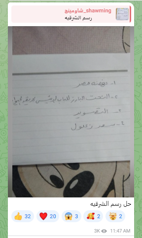 نشر أدمن جروب شاومينج للغش الإلكتروني، عددًا من الصور زعم أنها خاصة بامتحان الرسم لطلاب الشهادة الإعدادية 2024، والتي يؤديها الطلاب داخل اللجان في عددًا من محافظات الجمهورية، معلقًا عليها بقوله: “الحل خلال دقائق”.