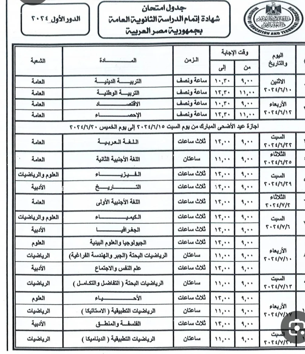 جدول امتحانات الثانوية العامة 2024 pdf.. علمي علوم - علمي رياضة - أدبي