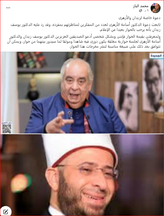 وقال الباز خلال منشور له على صفحته الشخصية على موقع التواصل الاجتماعي، “فيسبوك”: تابعت دعوة الدكتور أسامة الأزهرى لعدد من المفكرين لمناظرتهم بمفرده، وقد رد عليه الدكتور يوسف زيدان بأنه يرحب بالحوار بعيدا عن الإعلام، ولمعرفتي بقيمة الحوار فإنني وبشكل شخصى أدعو الصديقين العزيزين الدكتور يوسف زيدان والدكتور أسامة الأزهري لجلسة حوارية مغلقة يكون دوري فيه شاهدًا وموثقا لما سيدور بينهما من حوار.