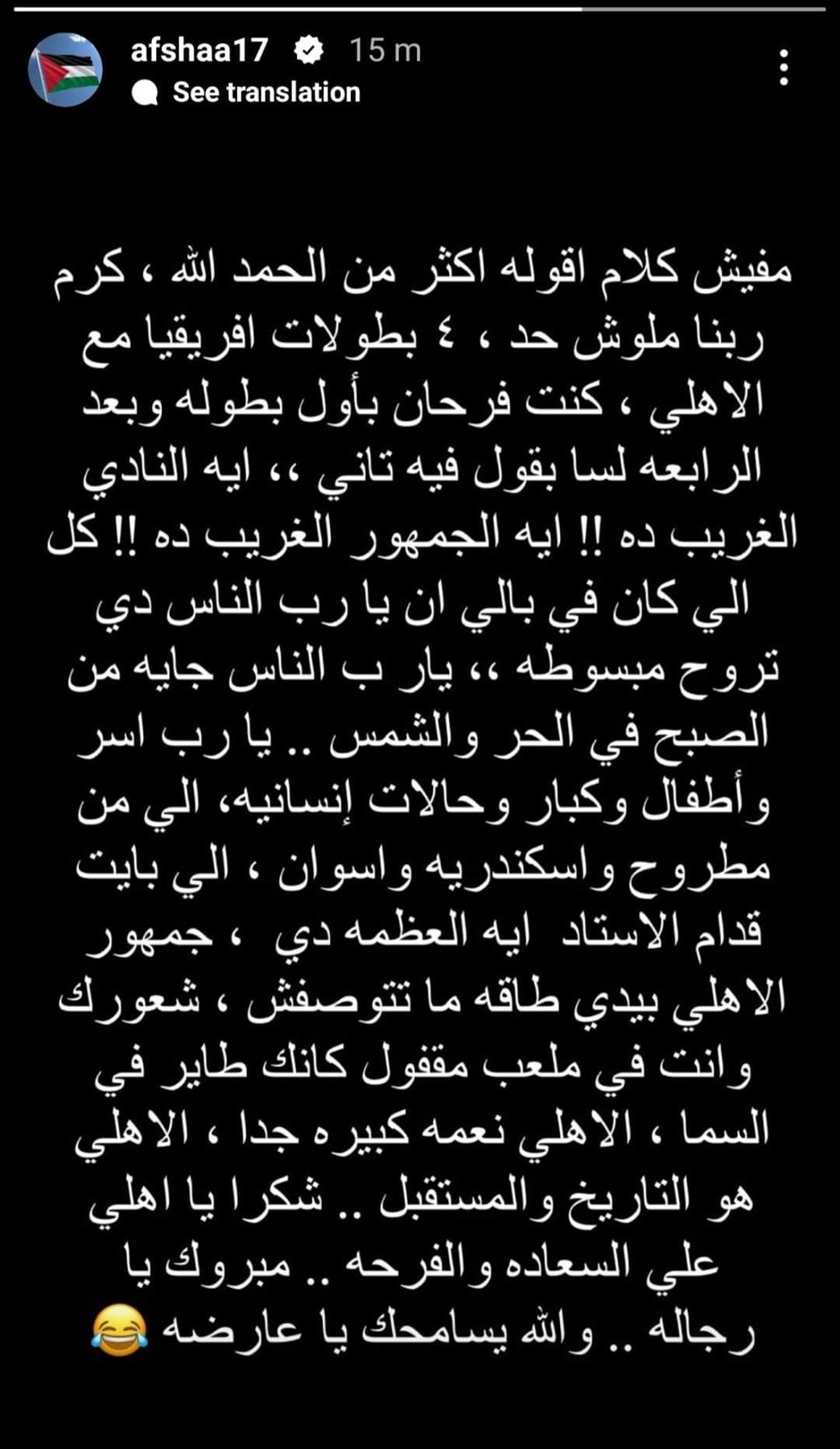 وكتب أفشة عبر حسابه الشخصي على موقع إنستجرام: مفيش كلام أقوله أكثر من الحمد الله، كرم ربنا ملوش حد، 4 بطولات إفريقيا مع الأهلي.