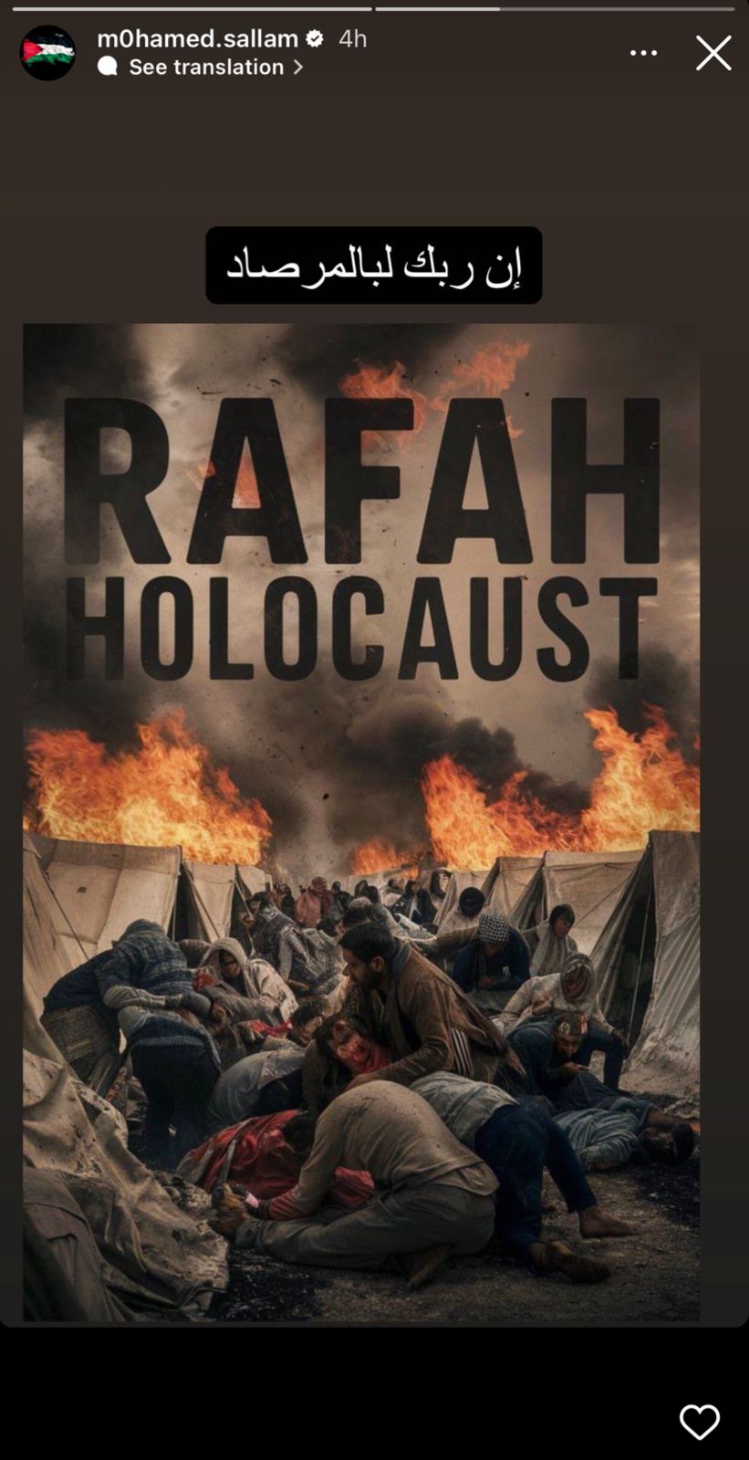 تضامن الفنان محمد سلام، مع الشعب الفلسطيني، بعد الهجوم الأخير الذي حدث فجر اليوم من قبل الكيان الصهيوني على مخيمات رفح، ما خلف مشاهد مروعة من الشهداء واحتراق مخيمات النازحين في هذه المنطقة المكتظة بهم.