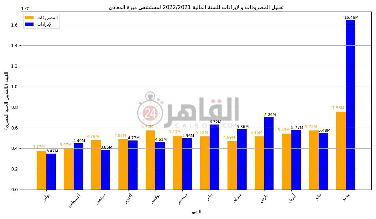وأظهر تحليل إيرادات ومصروفات العام المالي 2022/2021 للمستشفى تحقيق أرباح في 6 أشهر وخسائر في 6 أشهر وهم يوليو وسبتمبر وأكتوبر ونوفمبر وديسمبر 2021، ومايو 2022، أي نصف العام المالي خسائر والنصف آخر أرباح، لتصبح إجمالي الخسائر 2 مليون و954 ألف و553 جنيه مصري والأرباح 13 مليون 996 ألف و176 جنيه.