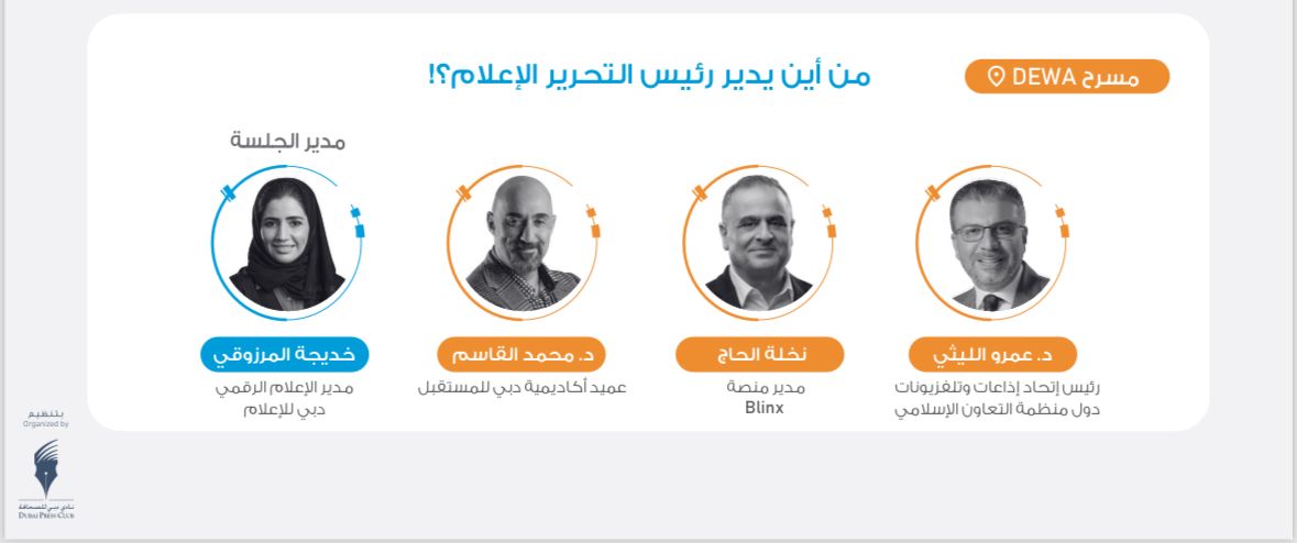 شارك الإعلامي الدكتور عمرو الليثي، رئيس اتحاد إذاعات وتلفزيونات دول منظمة التعاون الإسلامي، اليوم الثلاثاء 28 مايو، متحدثا في إحدى جلسات منتدى دبي للإعلام بعنوان من أين يدير رئيس التحرير الإعلام؟!، والتي تعقد فعالياته يومي 27 و28 مايو.