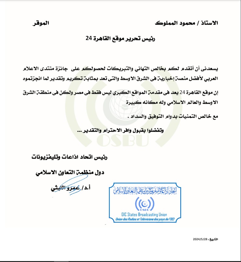اتحاد إذاعات وتليفزيونات التعاون الإسلامي يهنئ القاهرة 24 بحصوله على جائزة أفضل منصة إخبارية| صورة