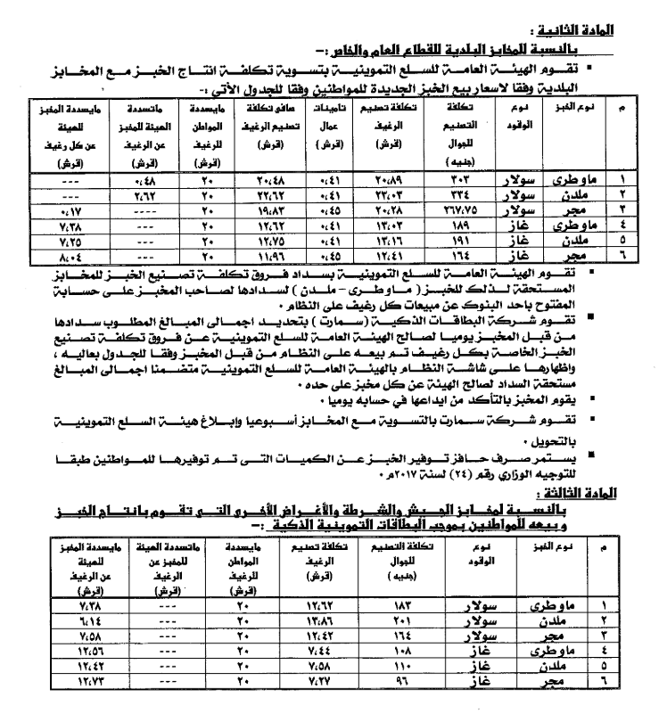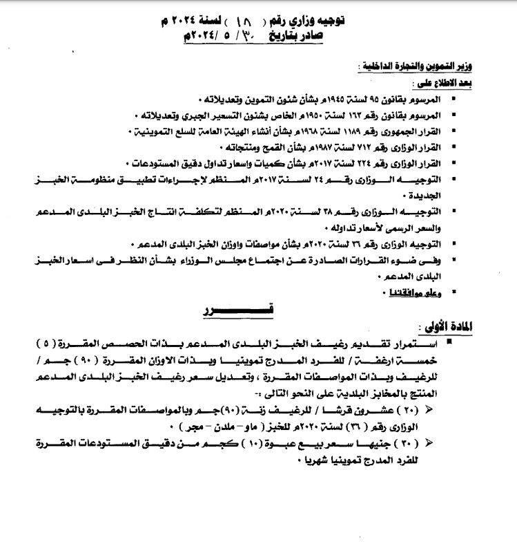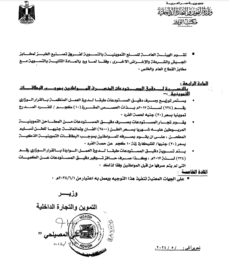 أصدر الدكتور علي المصيحلي وزير التموين، قرارًا بحصول كل فرد في البطاقة على 5 أرغفة يوميا، حيث نص القرار على: استمرار تقديم رغيف الخبز البلدي المدعم بذات الحصص المقررة 5 خمسة أرغفة / للفرد المدرج تموينيا وبذات الأوزان المقررة 90 جم / للرغيف وبذات المواصفات المقررة، وتعديل سعر رغيف الخبز البلدى المدعم المنتج بالمخابز البلدية على النحو التالي: