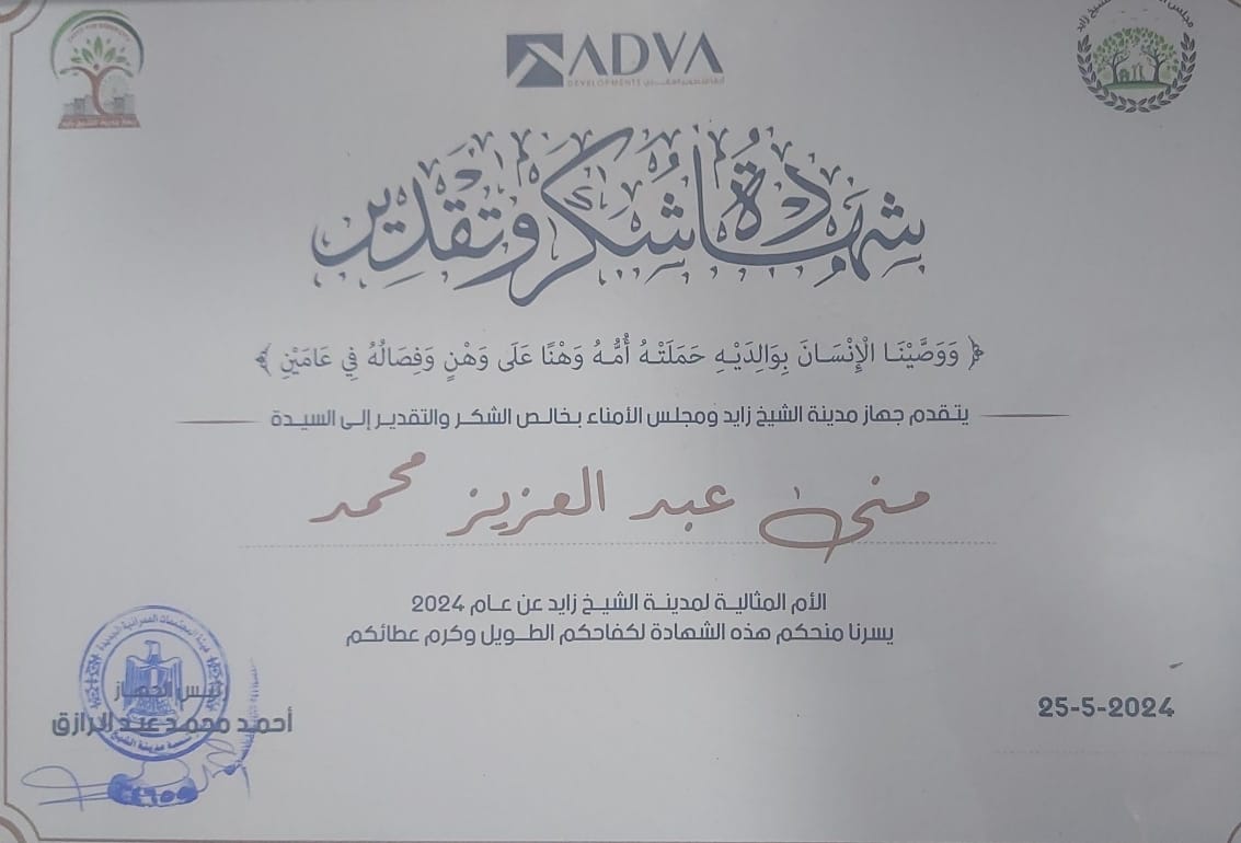 ومنح جهاز مدينة الشيخ زايد ومجلس الأمناء، شهادة الأم المثالية لـ مدينة الشيخ زايد عن عام 2024، لـ منى عبد العزيز محمد، مدير إدارة الموارد البشرية في مستشفى جلوبال كير الشيخ، في أجواء تسودها البهجة وتظللها الولاء والانتماء والمحبة؛ نظرًا لتفانيها في العمل وجهودها التي بذلتها على أكمل وجه خلال الفترة الماضية.
