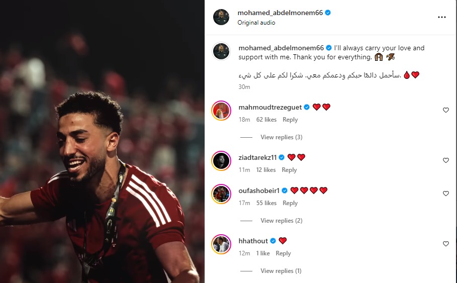 وقال محمد عبد المنعم عبر حسابه الرسمي على موقع إنستجرام لـ جمهور الأهلي: سأحمل دائمًا حبكم ودعمكم معي، شكرا لكم على كل شيء.