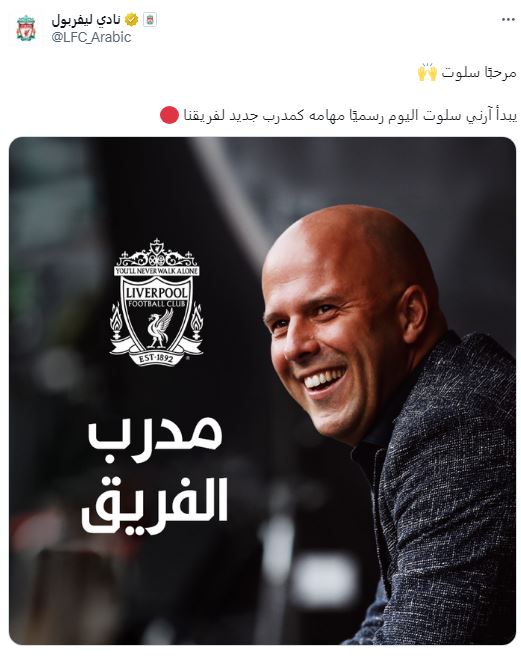 وكتب حساب ليفربول الرسمي عبر موقع إكس: مرحبًا سلوت.. يبدأ آرني سلوت اليوم رسميًا مهامه كمدرب جديد لفريقنا.