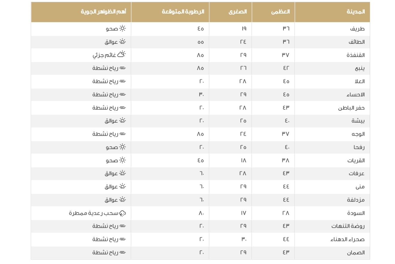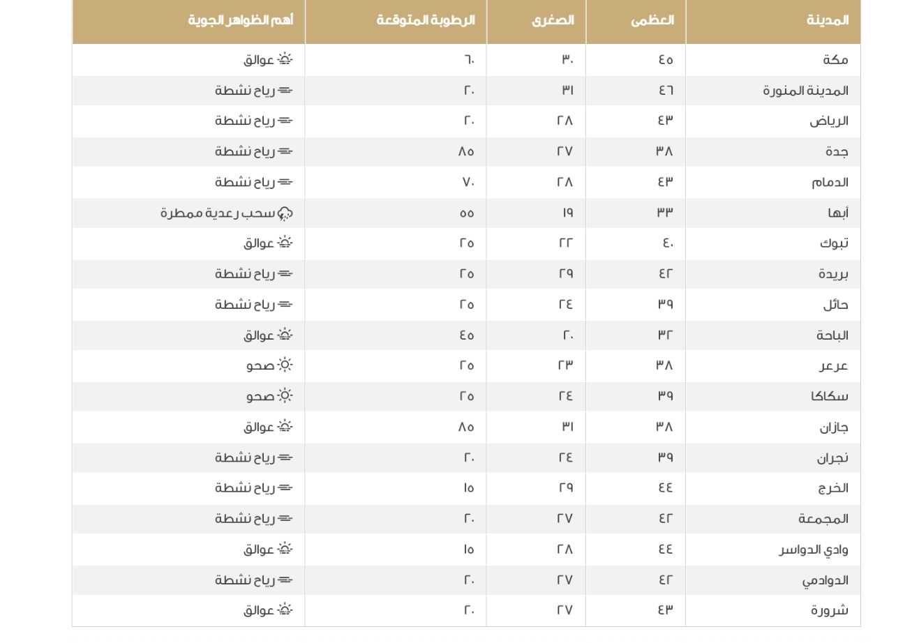وبين المركز درجات الحرارة في السعودية اليوم العظمى والصغرى بالدرجة المئوية والظواهر الجوية كالتالي: