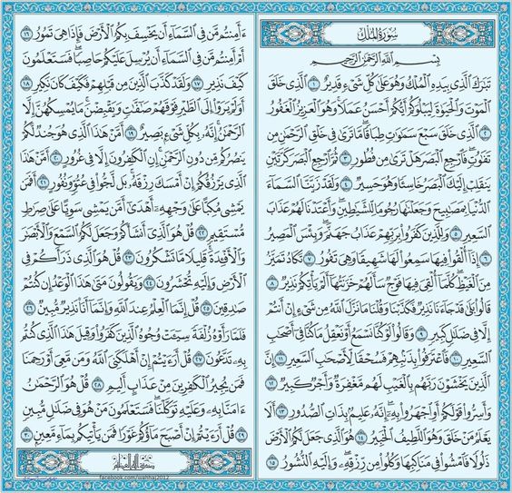 تَبَارَكَ الَّذِي بِيَدِهِ الْمُلْكُ وَهُوَ عَلَى كُلِّ شَيْءٍ قَدِيرٌ (1) الَّذِي خَلَقَ الْمَوْتَ وَالْحَيَاةَ لِيَبْلُوَكُمْ أَيُّكُمْ أَحْسَنُ عَمَلًا وَهُوَ الْعَزِيزُ الْغَفُورُ (2) الَّذِي خَلَقَ سَبْعَ سَمَاوَاتٍ طِبَاقًا مَا تَرَى فِي خَلْقِ الرَّحْمَنِ مِنْ تَفَاوُتٍ فَارْجِعِ الْبَصَرَ هَلْ تَرَى مِنْ فُطُورٍ (3) ثُمَّ ارْجِعِ الْبَصَرَ كَرَّتَيْنِ يَنْقَلِبْ إِلَيْكَ الْبَصَرُ خَاسِئًا وَهُوَ حَسِيرٌ (4) وَلَقَدْ زَيَّنَّا السَّمَاءَ الدُّنْيَا بِمَصَابِيحَ وَجَعَلْنَاهَا رُجُومًا لِلشَّيَاطِينِ وَأَعْتَدْنَا لَهُمْ عَذَابَ السَّعِيرِ (5) وَلِلَّذِينَ كَفَرُوا بِرَبِّهِمْ عَذَابُ جَهَنَّمَ وَبِئْسَ الْمَصِيرُ (6) إِذَا أُلْقُوا فِيهَا سَمِعُوا لَهَا شَهِيقًا وَهِيَ تَفُورُ (7) تَكَادُ تَمَيَّزُ مِنَ الْغَيْظِ كُلَّمَا أُلْقِيَ فِيهَا فَوْجٌ سَأَلَهُمْ خَزَنَتُهَا أَلَمْ يَأْتِكُمْ نَذِيرٌ (8) قَالُوا بَلَى قَدْ جَاءَنَا نَذِيرٌ فَكَذَّبْنَا وَقُلْنَا مَا نَزَّلَ اللَّهُ مِنْ شَيْءٍ إِنْ أَنْتُمْ إِلَّا فِي ضَلَالٍ كَبِيرٍ (9) وَقَالُوا لَوْ كُنَّا نَسْمَعُ أَوْ نَعْقِلُ مَا كُنَّا فِي أَصْحَابِ السَّعِيرِ (10) فَاعْتَرَفُوا بِذَنْبِهِمْ فَسُحْقًا لِأَصْحَابِ السَّعِيرِ (11) إِنَّ الَّذِينَ يَخْشَوْنَ رَبَّهُمْ بِالْغَيْبِ لَهُمْ مَغْفِرَةٌ وَأَجْرٌ كَبِيرٌ (12) وَأَسِرُّوا قَوْلَكُمْ أَوِ اجْهَرُوا بِهِ إِنَّهُ عَلِيمٌ بِذَاتِ الصُّدُورِ (13) أَلَا يَعْلَمُ مَنْ خَلَقَ وَهُوَ اللَّطِيفُ الْخَبِيرُ (14) هُوَ الَّذِي جَعَلَ لَكُمُ الْأَرْضَ ذَلُولًا فَامْشُوا فِي مَنَاكِبِهَا وَكُلُوا مِنْ رِزْقِهِ وَإِلَيْهِ النُّشُورُ (15) أَأَمِنْتُمْ مَنْ فِي السَّمَاءِ أَنْ يَخْسِفَ بِكُمُ الْأَرْضَ فَإِذَا هِيَ تَمُورُ (16) أَمْ أَمِنْتُمْ مَنْ فِي السَّمَاءِ أَنْ يُرْسِلَ عَلَيْكُمْ حَاصِبًا فَسَتَعْلَمُونَ كَيْفَ نَذِيرِ (17) وَلَقَدْ كَذَّبَ الَّذِينَ مِنْ قَبْلِهِمْ فَكَيْفَ كَانَ نَكِيرِ (18) أَوَلَمْ يَرَوْا إِلَى الطَّيْرِ فَوْقَهُمْ صَافَّاتٍ وَيَقْبِضْنَ مَا يُمْسِكُهُنَّ إِلَّا الرَّحْمَنُ إِنَّهُ بِكُلِّ شَيْءٍ بَصِيرٌ (19) أَمَّنْ هَذَا الَّذِي هُوَ جُنْدٌ لَكُمْ يَنْصُرُكُمْ مِنْ دُونِ الرَّحْمَنِ إِنِ الْكَافِرُونَ إِلَّا فِي غُرُورٍ (20) أَمَّنْ هَذَا الَّذِي يَرْزُقُكُمْ إِنْ أَمْسَكَ رِزْقَهُ بَلْ لَجُّوا فِي عُتُوٍّ وَنُفُورٍ (21) أَفَمَنْ يَمْشِي مُكِبًّا عَلَى وَجْهِهِ أَهْدَى أَمَّنْ يَمْشِي سَوِيًّا عَلَى صِرَاطٍ مُسْتَقِيمٍ (22) قُلْ هُوَ الَّذِي أَنْشَأَكُمْ وَجَعَلَ لَكُمُ السَّمْعَ وَالْأَبْصَارَ وَالْأَفْئِدَةَ قَلِيلًا مَا تَشْكُرُونَ (23) قُلْ هُوَ الَّذِي ذَرَأَكُمْ فِي الْأَرْضِ وَإِلَيْهِ تُحْشَرُونَ (24) وَيَقُولُونَ مَتَى هَذَا الْوَعْدُ إِنْ كُنْتُمْ صَادِقِينَ (25) قُلْ إِنَّمَا الْعِلْمُ عِنْدَ اللَّهِ وَإِنَّمَا أَنَا نَذِيرٌ مُبِينٌ (26) فَلَمَّا رَأَوْهُ زُلْفَةً سِيئَتْ وُجُوهُ الَّذِينَ كَفَرُوا وَقِيلَ هَذَا الَّذِي كُنْتُمْ بِهِ تَدَّعُونَ (27) قُلْ أَرَأَيْتُمْ إِنْ أَهْلَكَنِيَ اللَّهُ وَمَنْ مَعِيَ أَوْ رَحِمَنَا فَمَنْ يُجِيرُ الْكَافِرِينَ مِنْ عَذَابٍ أَلِيمٍ (28) قُلْ هُوَ الرَّحْمَنُ آمَنَّا بِهِ وَعَلَيْهِ تَوَكَّلْنَا فَسَتَعْلَمُونَ مَنْ هُوَ فِي ضَلَالٍ مُبِينٍ (29) قُلْ أَرَأَيْتُمْ إِنْ أَصْبَحَ مَاؤُكُمْ غَوْرًا فَمَنْ يَأْتِيكُمْ بِمَاءٍ مَعِينٍ (30) صدق الله العظيم.