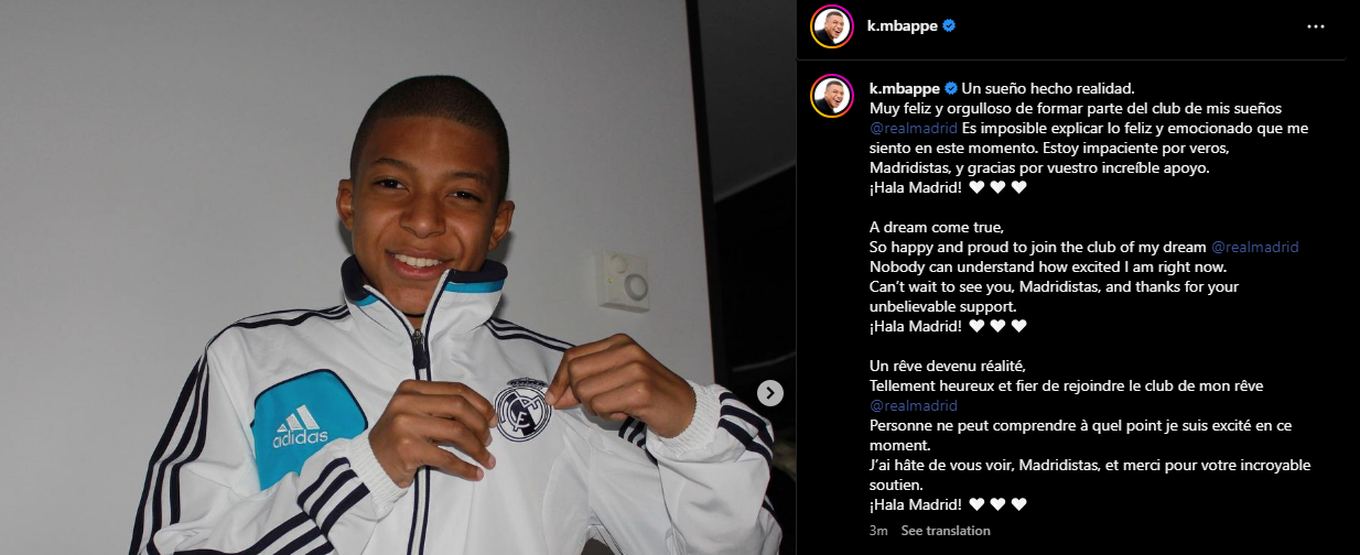 وقال مبابي عبر حسابه الرسمي على موقع التواصل الاجتماعي إنستجرام: حلمي تحقق، سعيد جدًا وفخور بأن أكون جزءًا من نادي أحلامي ريال مدريد.