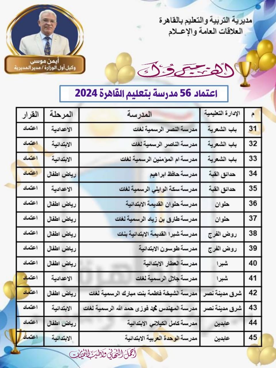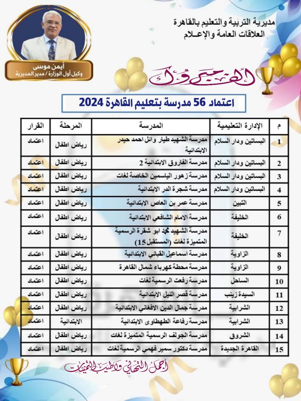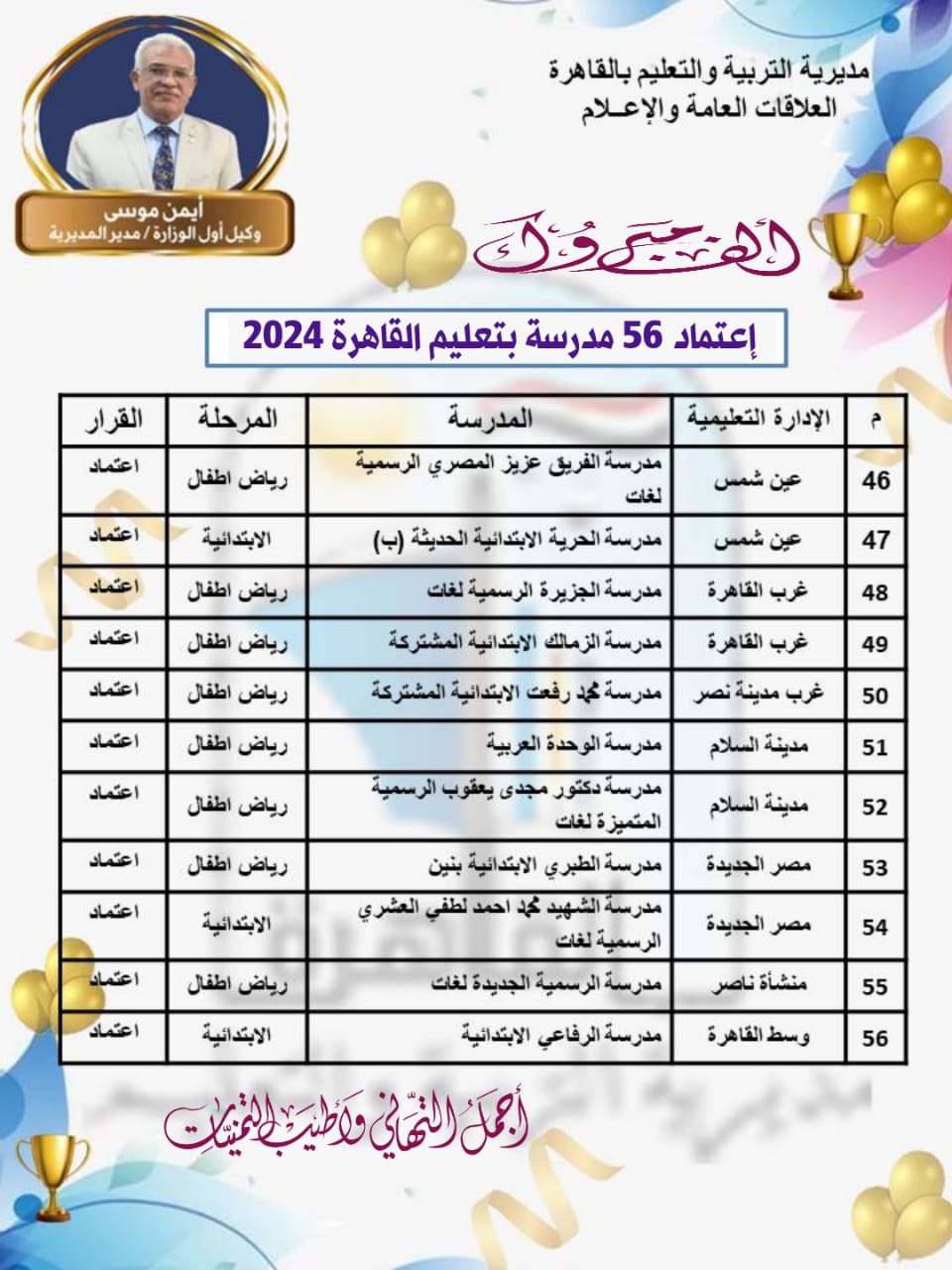 شكر أيمن موسى وكيل أول الوزارة - مدير مديرية التربية والتعليم بمحافظة القاهرة، فريق قياس الجودة بالمديرية والإدارات التعليمية ومديري العموم ووكلاء الإدارات ومديري أقسام الجودة ومديري المدارس ومنسقي الجودة، وفريق العمل بالمدارس على اعتماد دفعة جديدة بعدد 56 مدرسة من مدارس القاهرة.