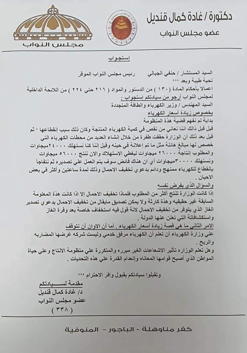تقدمت الدكتورة غادة قنديل عضوة مجلس النواب في محافظة المنوفية، بطلب استجواب للدكتور محمد شاكر وزير الكهرباء والطاقة المتجددة، بشأن زيادة أسعار الكهرباء.
