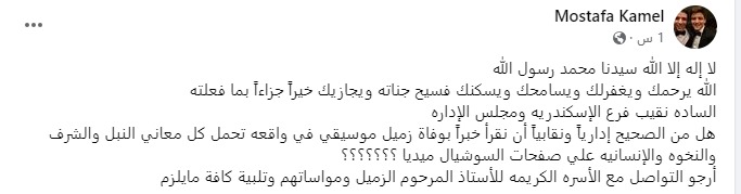 وكتب مصطفى كامل، عبر حسابه الشخصي بموقع التواصل الاجتماعي، فيسبوك: لا إله إلا الله سيدنا محمد رسول الله.. الله يرحمك ويغفر لك ويسامحك ويسكنك فسيح جناته ويجازيك خيرًا جزاء بما فعلته.. السادة نقيب فرع الإسكندرية ومجلس الإدارة، هل من الصحيح إداريًا ونقابيًا أن نقرأ خبرًا بوفاة زميل موسيقي في واقعة تحمل كل معاني النبل والشرف والنخوة والإنسانية على صفحات السوشيال ميديا؟ أرجو التواصل مع الأسرة الكريمة للأستاذ المرحوم الزميل ومواساتهم وتلبية كافة ما يلزم.
