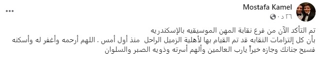 وعاد مصطفى كامل، تكفل النقابة بـ أسرة الراحل، حيث كتب: تم التأكد الآن من فرع نقابة المهن الموسيقية بالإسكندرية، بأن كل التزامات النقابة قد تم القيام بها لأهلية الزميل الراحل منذ أول أمس.. اللهم أرحمه وأغفر له وأسكنه فسيح جنانك وجازه خيرًا يارب العالمين وألهم أسرته وذويه الصبر والسلوان.
