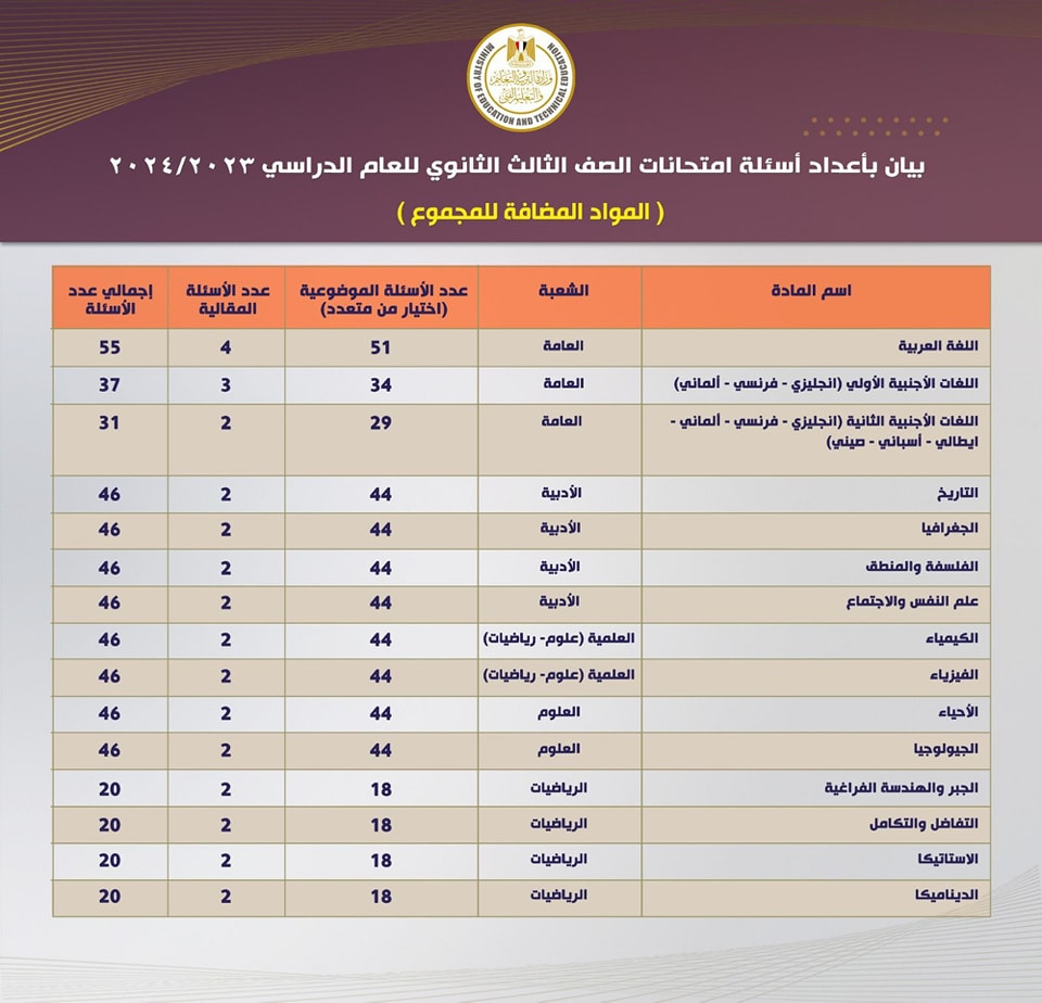 ولذلك نستعرض معكم أبرز نماذج امتحانات الثانوية العامة في اللغة الإنجليزية وفقا لـ النماذج الاسترشادية الخاصة بوزارة التربية والتعليم، كما أوضحت الوزارة كذلك عدد الأسئلة وتوزيع الدرجات لكل المواد ومنها مادة اللغة الإنجليزية كالتالي: