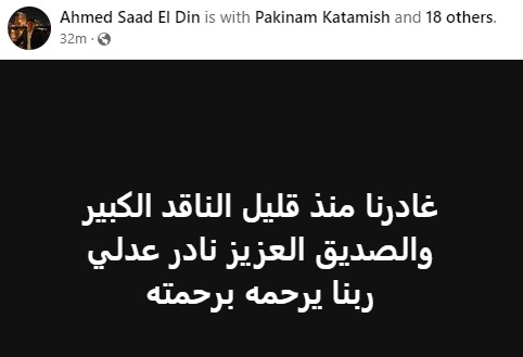 وكتب أحمد سعد الدين، عبر حسابه الشخصي بموقع فيسبوك: غادرنا منذ قليل الناقد الكبير والصديق العزيز نادر عدلي.. ربنا يرحمه برحمته.