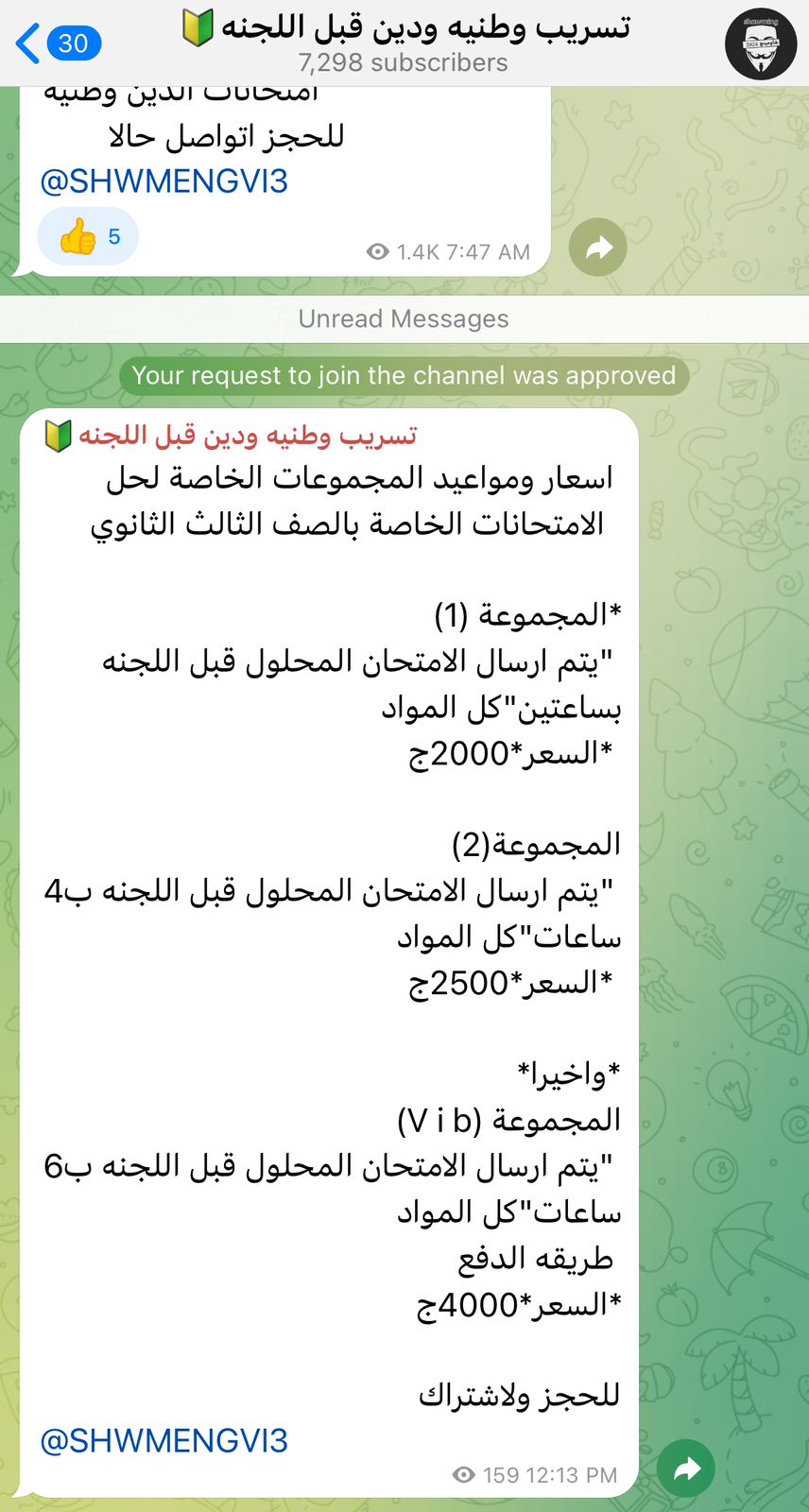 في ساعات متأخرة من مساء أمس الأحد، نشر أدمن جروبات الغش الإلكتروني شاومينج على تليجرام، صورة يلوّح من خلالها ويزعم أنها خاصة بتسريب الامتحانات لطلاب الثانوية العامة 2024، والذي سيؤديه الطلاب داخل اللجان على مستوى الجمهورية، مطالبًا إياهم بدخول الجروب السري، والذي يشترط دفع مبالغ مالية لدخوله.