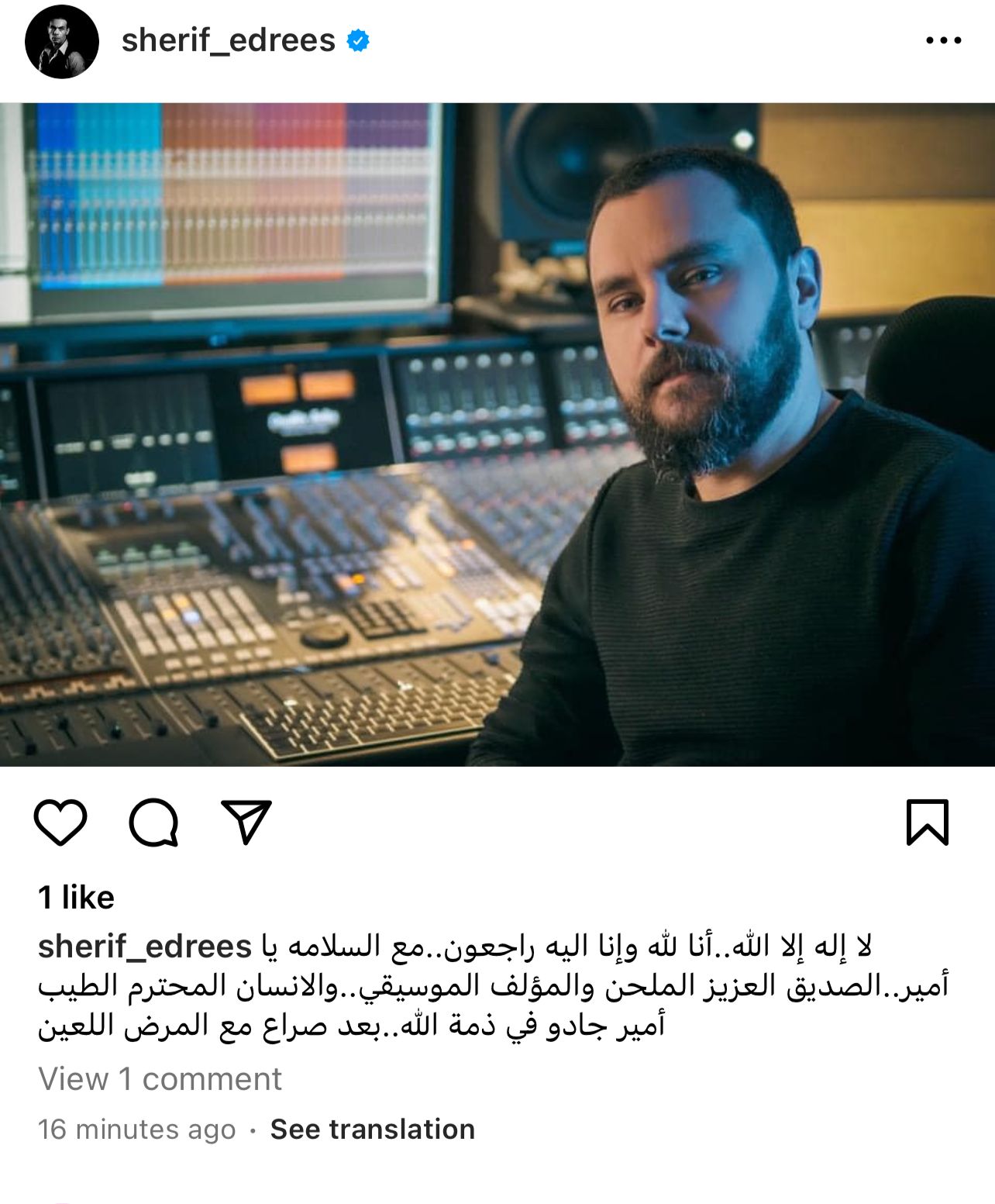 وأعلن الفنان شريف إدريس، خبر وفاة الملحن أمير جادو، وكتب عبر حسابه الشخصي بموقع تبادل الصور والفيديوهات إنستجرام: لا إله إلا الله.. إنا لله وإنا إليه راجعون.. مع السلامة يا أمير، الصديق العزيز الملحن والمؤلف الموسيقي والإنسان المحترم والطيب أمير جادو في ذمة الله بعد صراع مع المرض اللعين.