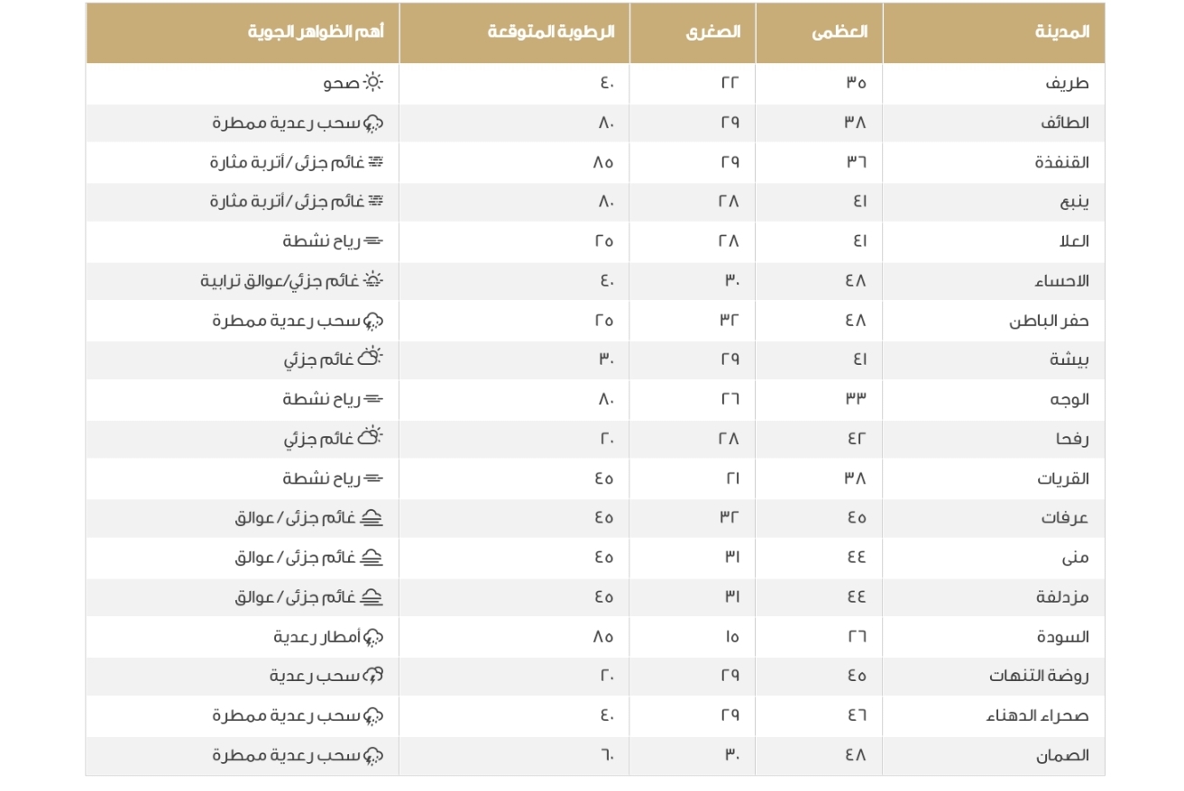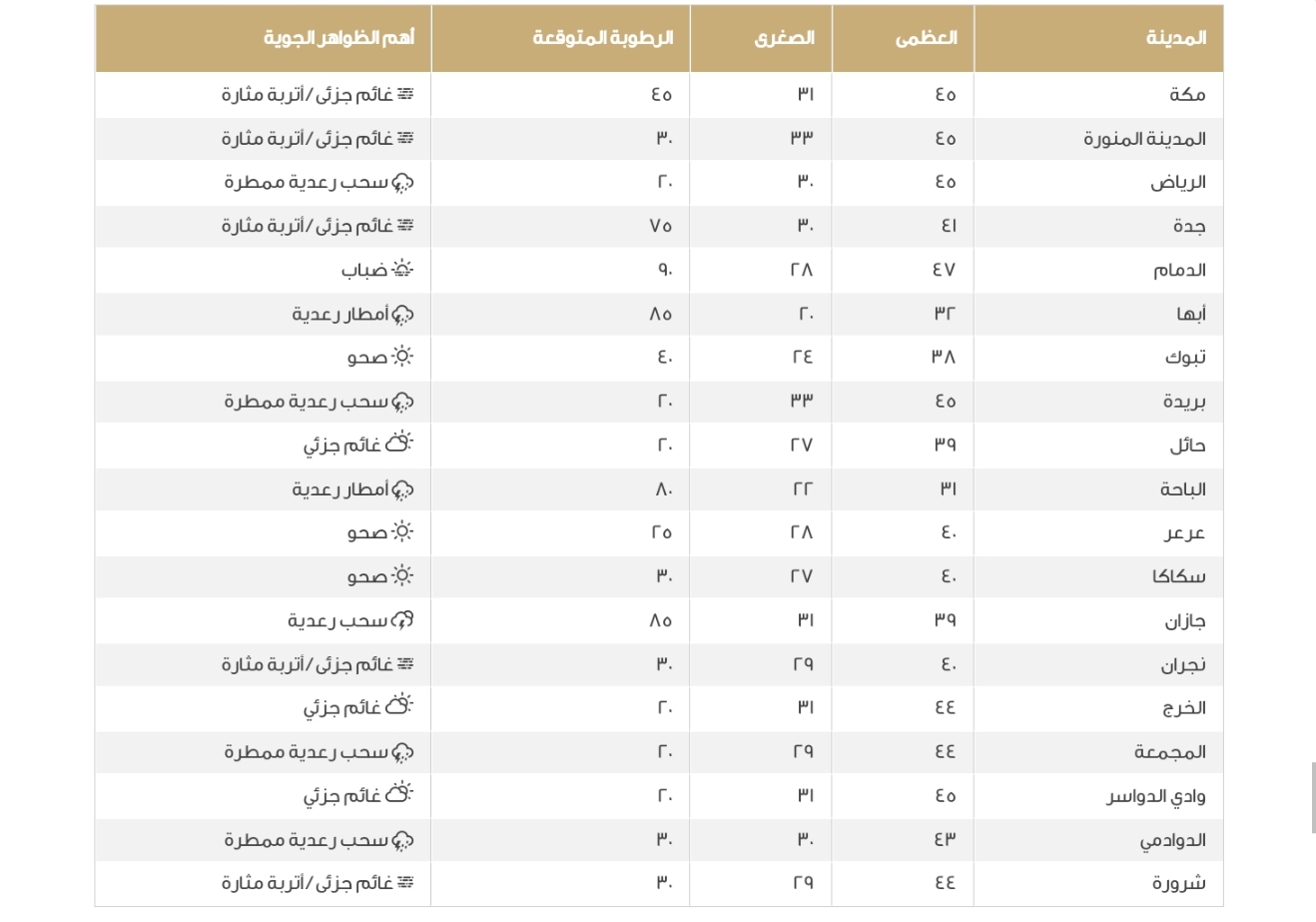 ووفقا لبيان المركز، يتوقع أن تكون معدلات درجات الحرارة اليوم في السعودية العظمى والصغرى بالدرجة المئوية والظواهر الجوية كالتالي:
