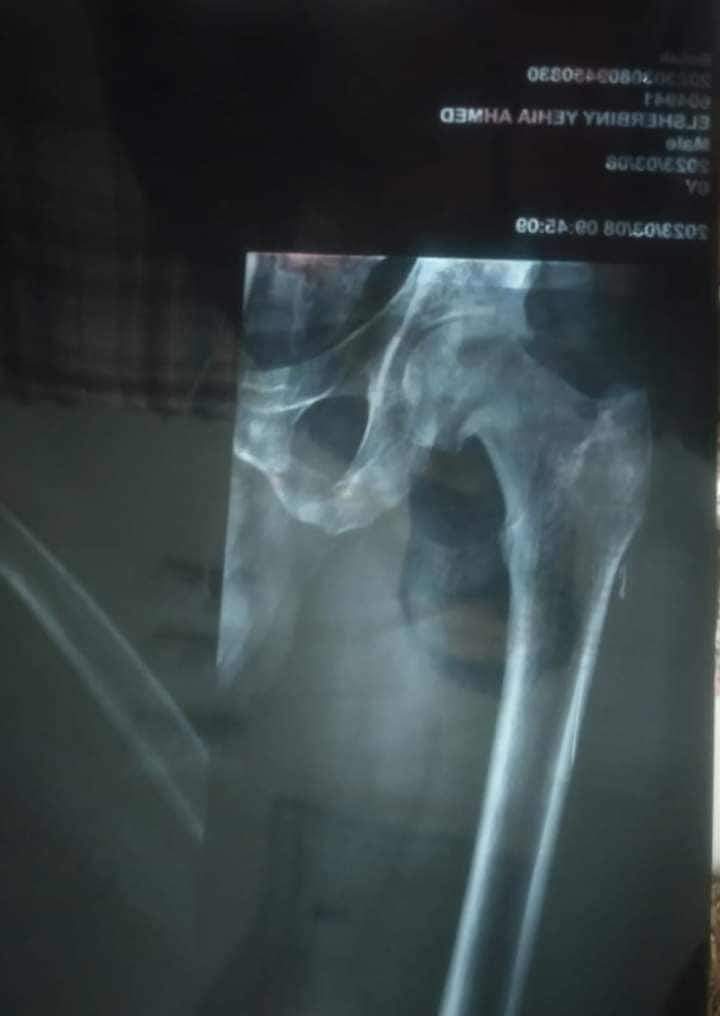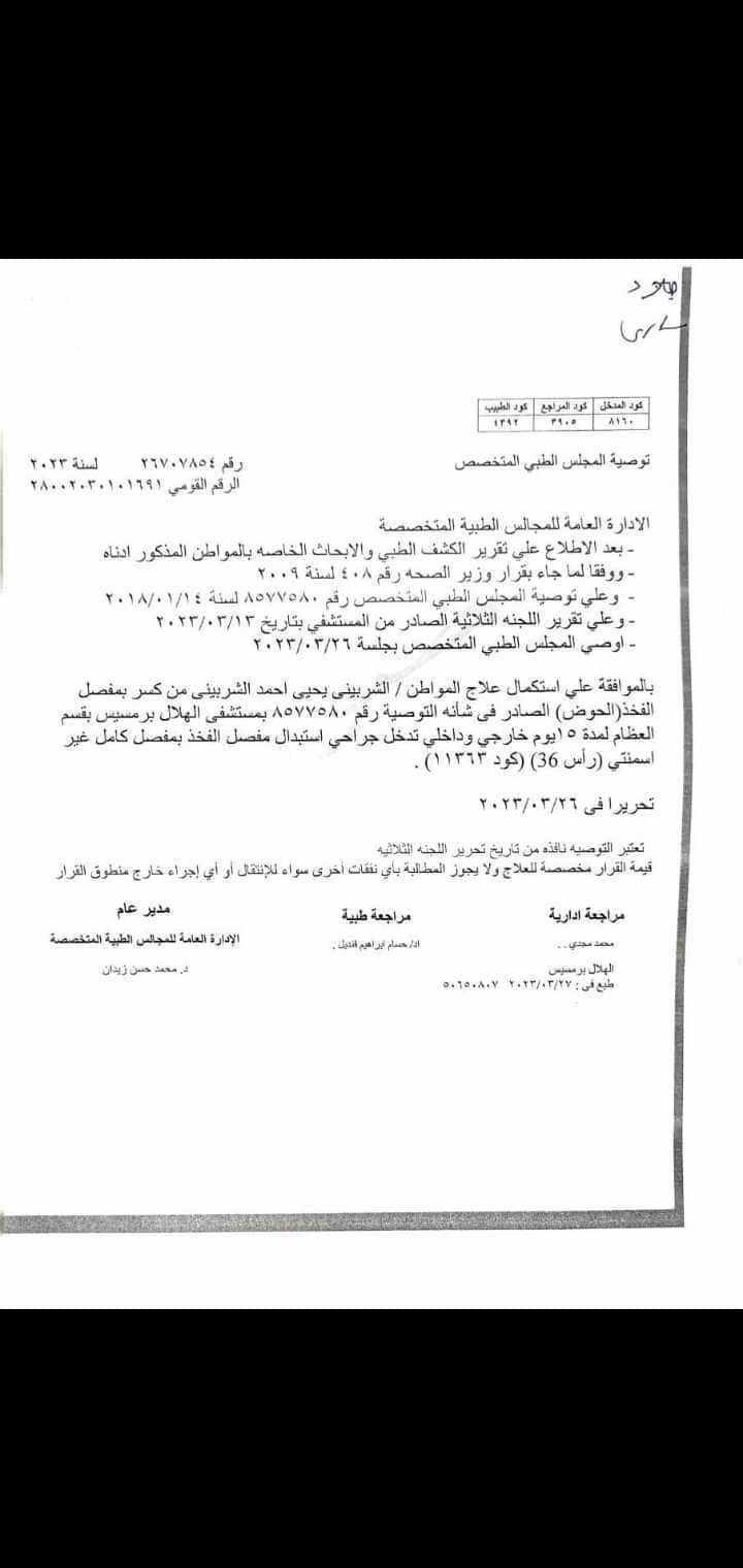 وأضاف: صدر قرار يوم 26 مارس 2023 بعمل عملية تغير مفصل الفخذ مع العلاج ومع نقل المريض، ومن السنة اللي فاتت العملية متأجلة بحجة عدم وجود مفاصل في مستشفى الهلال.