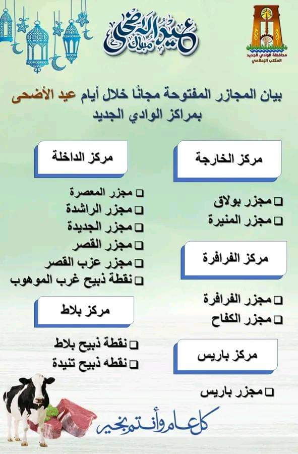 وقال اللواء محمد الزملوط محافظ الوادى الجديد، إنه تقرر فتح مجزرين بمركز الخارجة وهم مجزر المنيرة ومجزر بولاق، كما تقرر فتح 6 مجازر بمركز الداخلة وهم: مجزر المعصرة، ومجزر الراشدة، ومجزر الجديدة، ومجزر القصر، ومجزر عزب القصر، ونقطة ذبيح غرب الموهوب، وفي مركز الفرافرة سيتم فتح مجزر الفرافرة ومجزر الكفاح، وفي مركز بلاط نقطة ذبيح بلاط ونقطة ذبيح تنيدة، وفي مركز باريس سيتم فتح مجزر باريس.