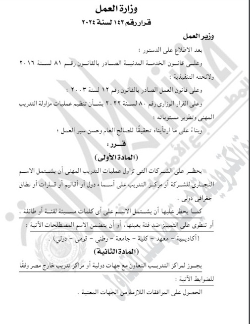 وجاء قرار المادة الأولى كالاتي: يحظر على الشركات التي تزاول عمليات التدريب المهني أن يشتمل الاسم التجاري للشركة أو مركز التدريب على أسماء دول أو أقاليم أو قارات أو نطاق جغرافي دولي، كما يحظر عليها أن يشتمل الاسم على أي كلمات مسيئة لفئة أو طائفة، أو تنطوي على التمييز ضد فئة بعينها، أو أن يتضمن الاسم المصطلحات الآتية:" أكاديمية - معهد – كلية – جامعة – وطني - قومي – دولي".