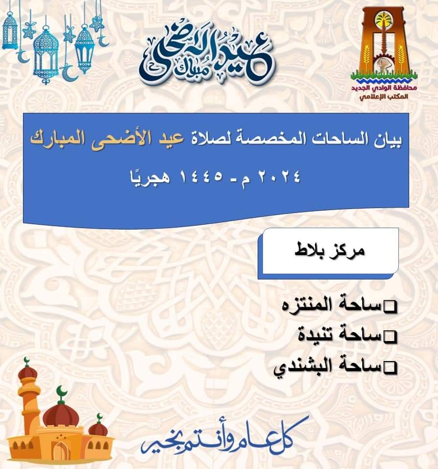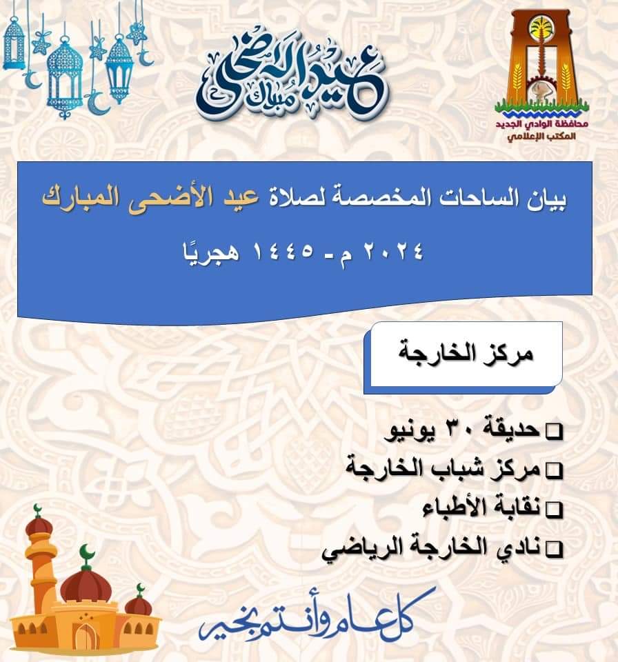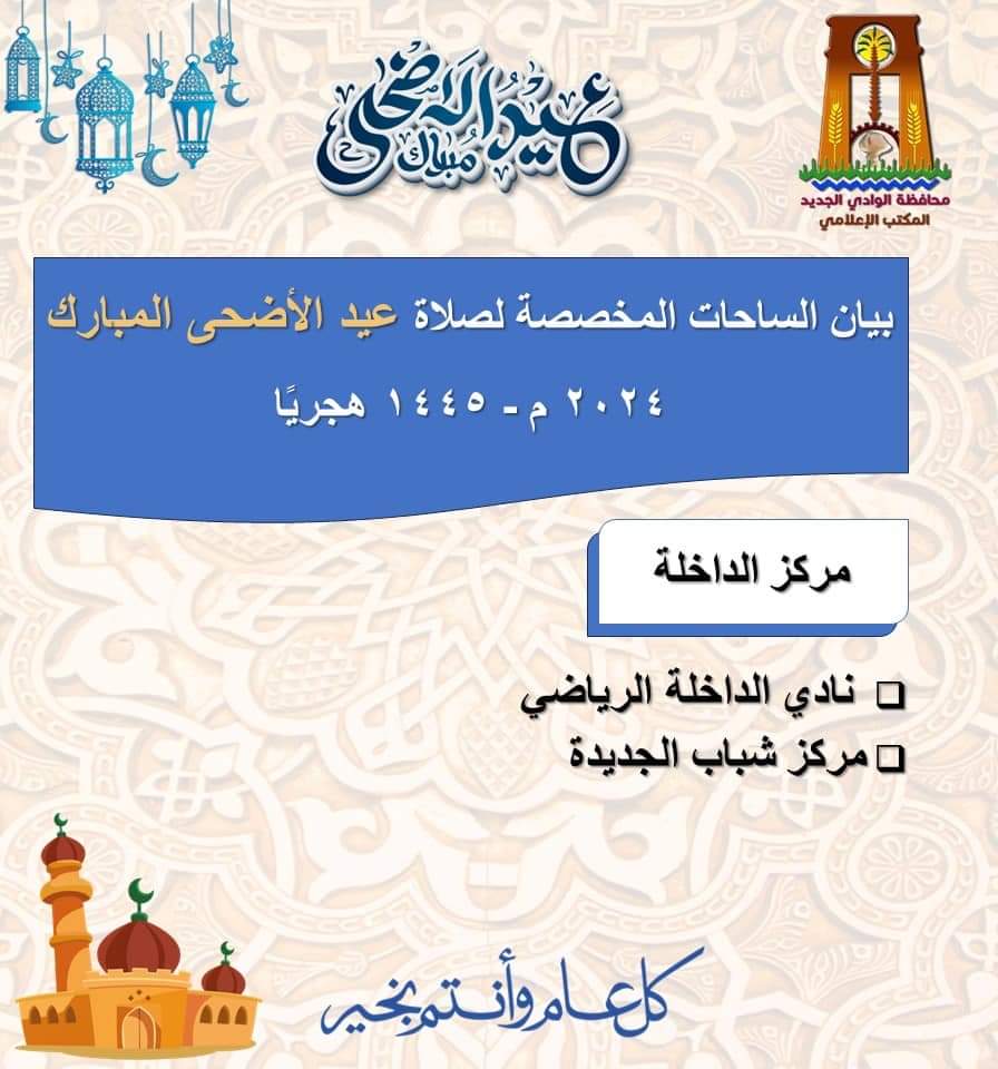 قال اللواء دكتور محمد الزملوط محافظ الوادي الجديد، إنه تم الانتهاء من تجهيز وفرش 10 ساحات كبرى و202 مسجد لأداء صلاة عيد الأضحى المبارك على مستوى المحافظة، وتحديد إمام وخطيب بكل مسجد وساحة لأداء الشعائر بالتنسيق مع وزارة الأوقاف.