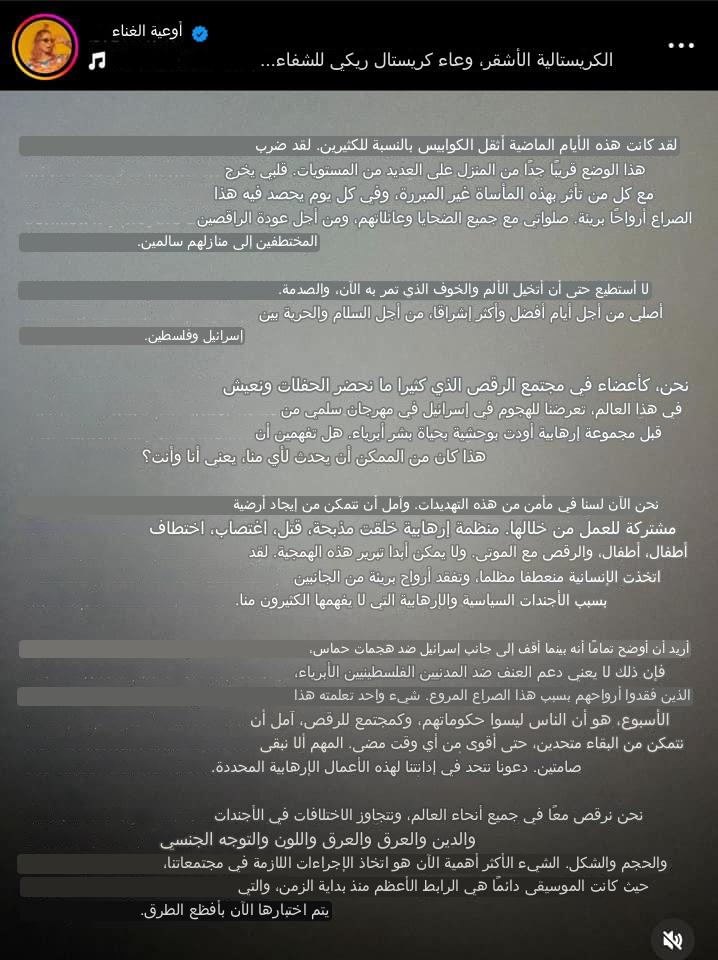 وواصلت blondish: لا يمكن أبدا تبرير هذه الهمجية، لقد اتخذت الإنسانية منعطفا مظلما، فيما فقدنا أرواحا بريئة من الجانبين، بسبب الأجندات السياسية والإرهابية التي لا يفهمها كثيرون منا، صامتون، دعونا نتحد في إدانتنا لهذه الأعمال الإرهابية المحددة، نحن نرقص معًا في جميع أنحاء العالم، ونتجاوز الاختلافات في الأجندات والدين والعرق واللون والتوجه الجنسي، والحجم والشكل.