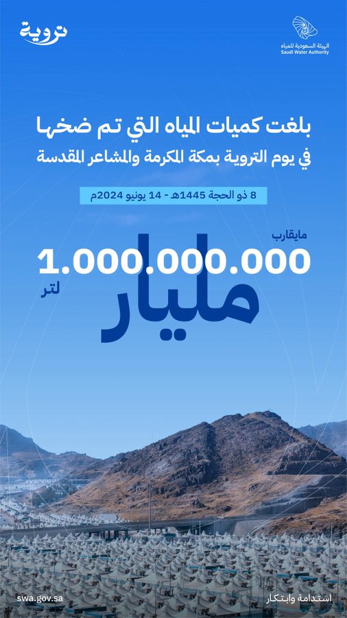 أعلنت الهيئة السعودية للمياه عن ضخ ما يقارب المليار لتر من المياه في مكة المكرمة والمشاعر المقدسة خلال يوم التروية، في إطار خطتها التشغيلية لتأمين الإمداد لضيوف الرحمن وكافة المستفيدين في موسم الحج.