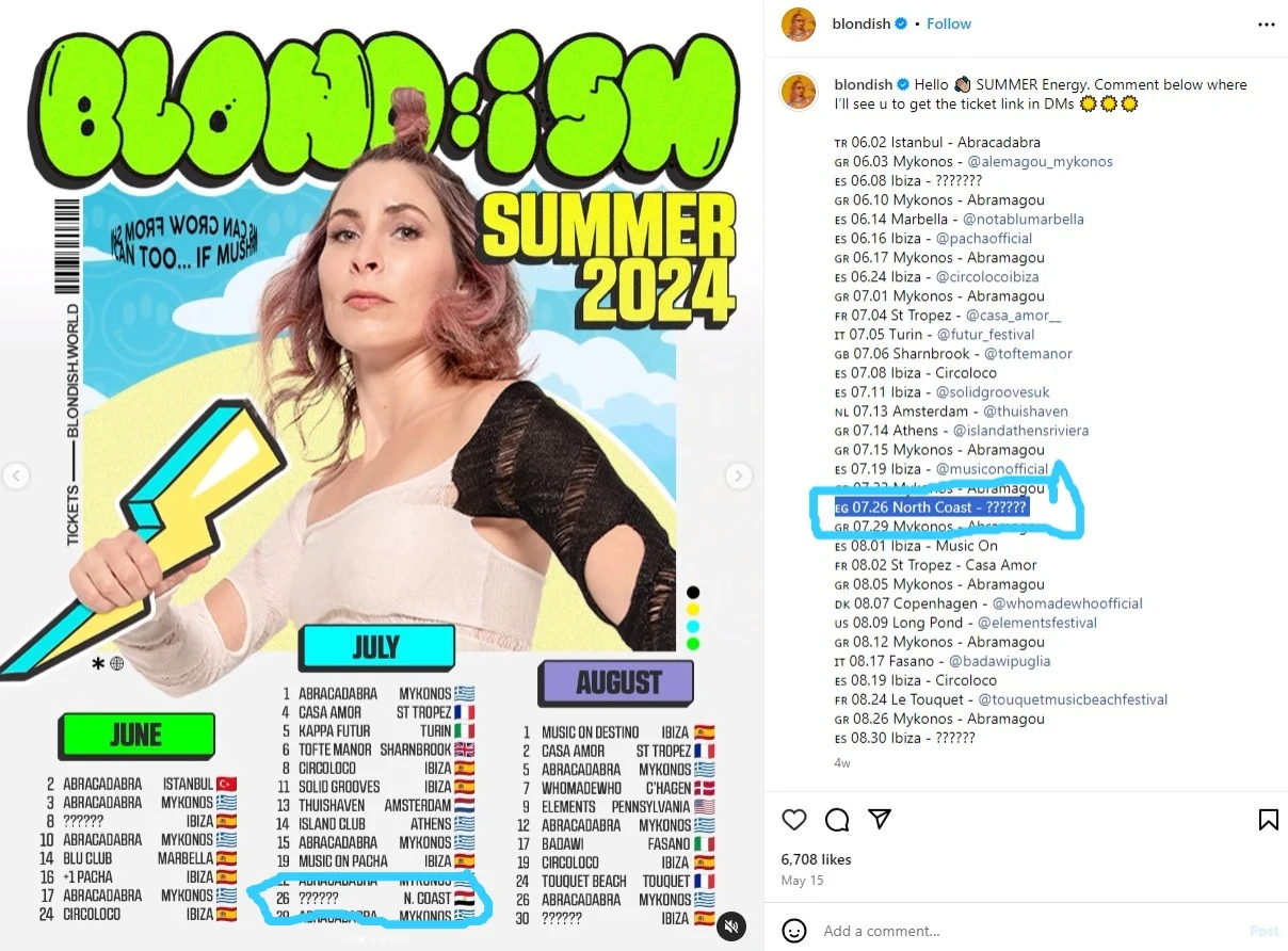 وكانت المغنية الكندية blondish بلونديش، أعلنت خريطة حفلاتها خلال صيف 2024، وذلك عبر حسابها الشخصي على موقع تبادل الصور والفيديوهات إنستجرام، ومن ضمن هذه الحفلات حفل في مصر بالساحل الشمالي، ومن المقرر إقامته يوم 26 يوليو 2024.